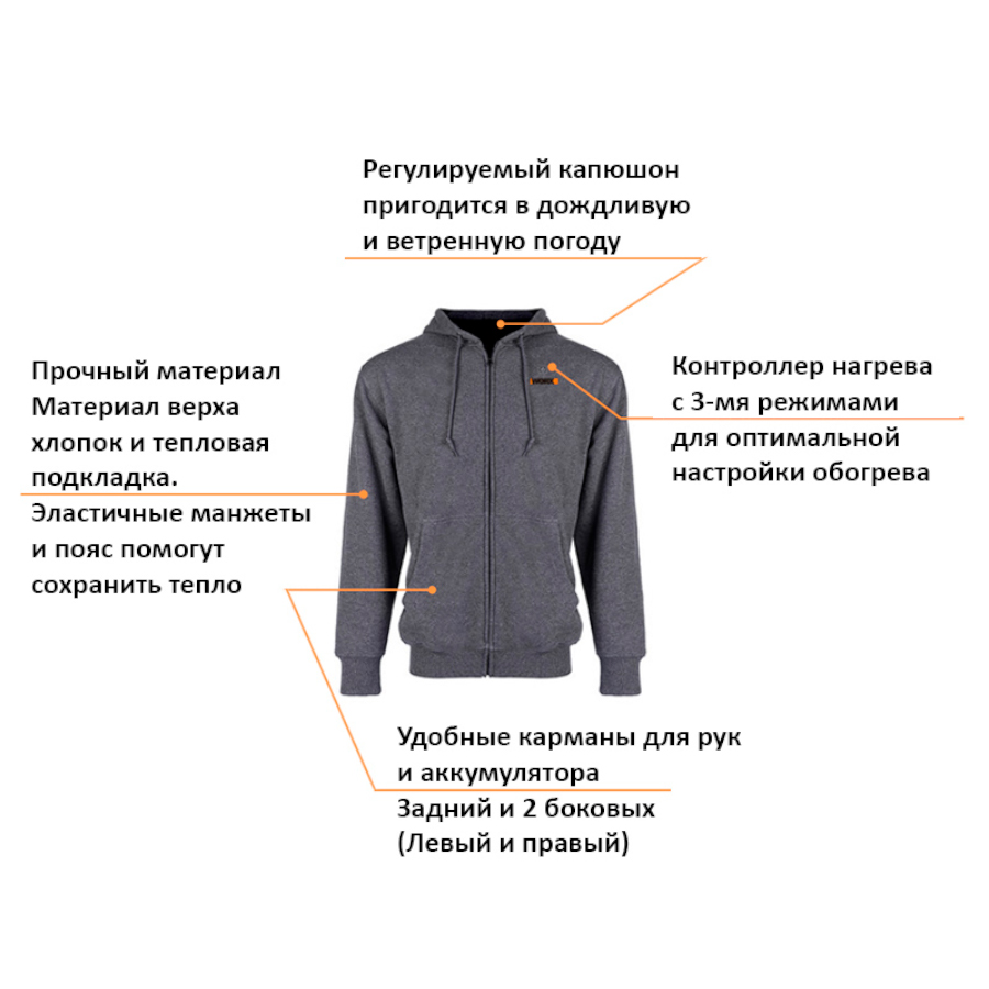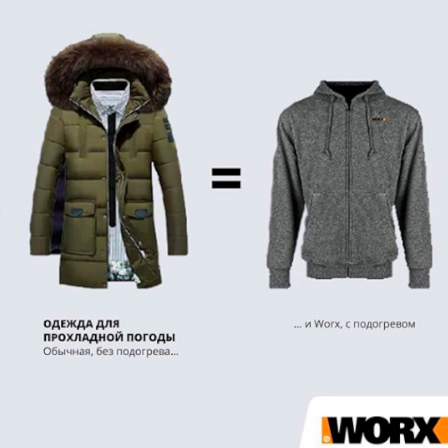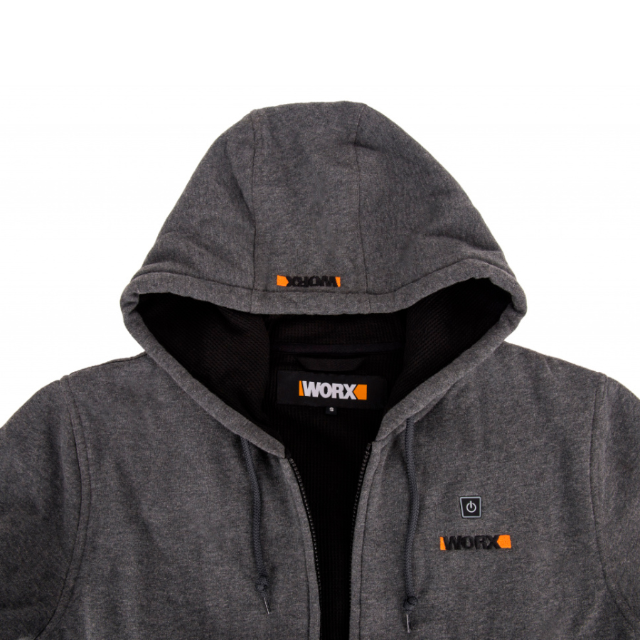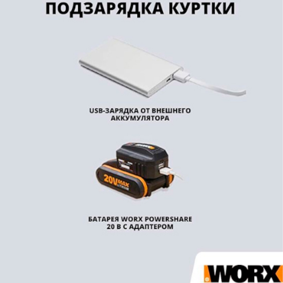 Толстовка с подогревом WORX WA4660 отлично подходит для наружных работ во время холодов. Для работы встроенного устройства подогрева необходим источник питания аккумулятор WORX WA4009 или обычный пауэрбанк.