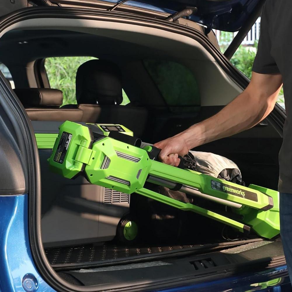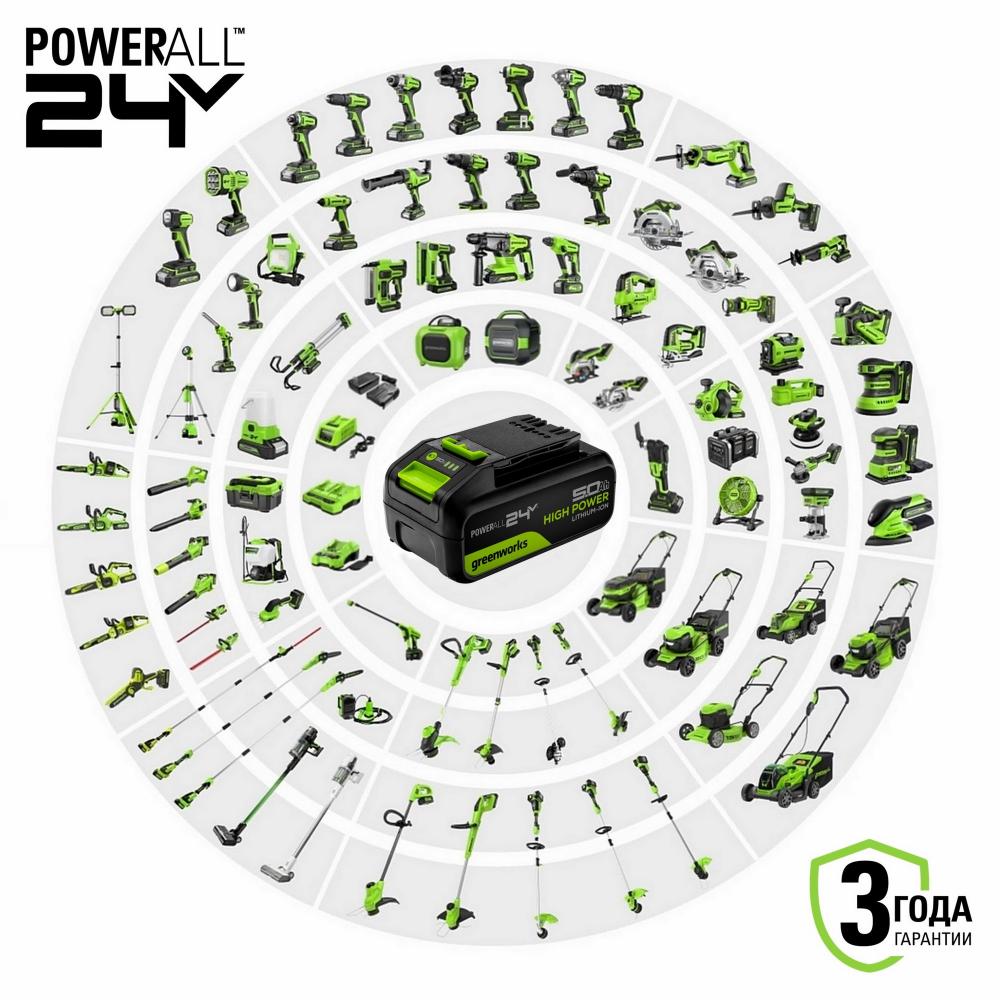 - Модель работает от аккумуляторной батареи 24V, совместимой со всеми устройствами Greenworks 24V.