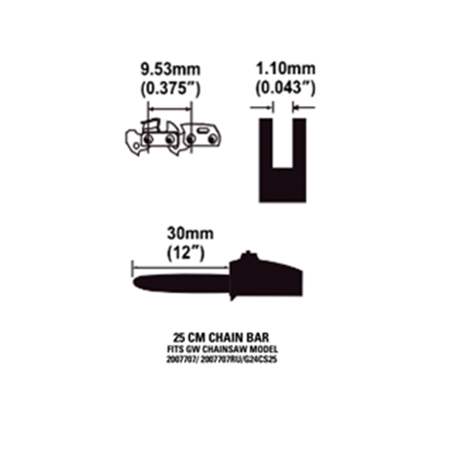 Длина шины 25 см (10"). Паз 1,1 мм (0,043").