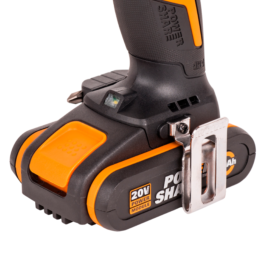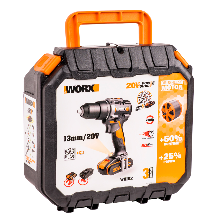 Аккумуляторная дрель оснащена мощным бесщеточным двигателем, который легко справляется с деревом и металлом. Современные бесщеточные двигатели Brushless Motor TM получили на 25% больше мощности и увеличенный в 10 раз срок службы, в сравнении с щеточными аналогами. Имея максимальный крутящий момент 60Нм, двигатель обеспечивает скорость вращения шпинделя от 600 до 2000 оборотов в минуту. Быстрозажимной 13-ти миллиметровый патрон имеет блокировку шпинделя и позволяет менять оснастку одной рукой. Для подготовки WORX WX102 к работе потребуется минимум времени и усилий. Универсальная дрель-шуруповерт легко адаптируется под любые задачи. Дрель предусматривает 2 скорости – для сверления и работы с крепежом, 18 ступеней регулировки крутящего момента и настройку стороны вращения. Гибкая настройка инструмента позволяет аккуратно сверлить материалы разной плотности. Конструкция WORX WX102 предусматривает все для комфортной эксплуатации. Эргономичная рукоятка с резиновым покрытием и вес чуть более 1кг способствуют уверенному хвату и полному контролю за инструментом. Ударная дрель оснащена LED подсветкой, обеспечивающей комфортную и безопасную эксплуатацию даже в условиях ограниченной видимости. Для удобства переноски, корпус устройства дополнен поясным крепежом. А наличие индикатора заряда батареи прямо на корпусе инструмента, позволит всегда контролировать время оставшейся работы. Универсальные компактные аккумуляторы серии Powershare – это емкие и долговечные источники питания с электронной платой защиты от глубокого разряда и перегрева. Литий-ионные батареи гарантируют быстрое начало работы и могут использоваться с другими инструментами WORX. Оцените удобство работы без проводов и розеток с WORX Powershare!