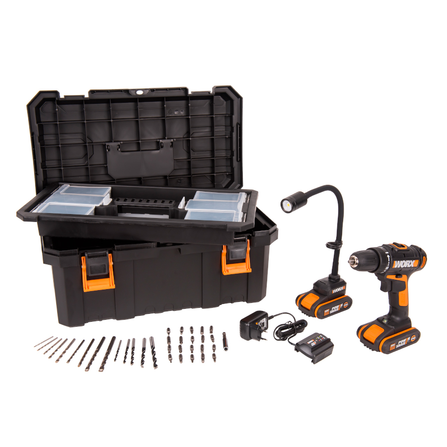 Фонарь аккумуляторный WX028, Набор оснастки 35 шт., 2 аккумулятора Li-Ion емкостью 1,5 А*ч, Зарядное устройство WORX 20В 0,4А, Кейс.