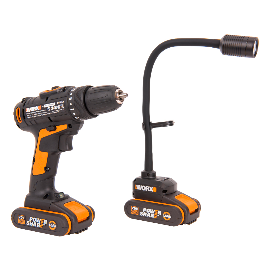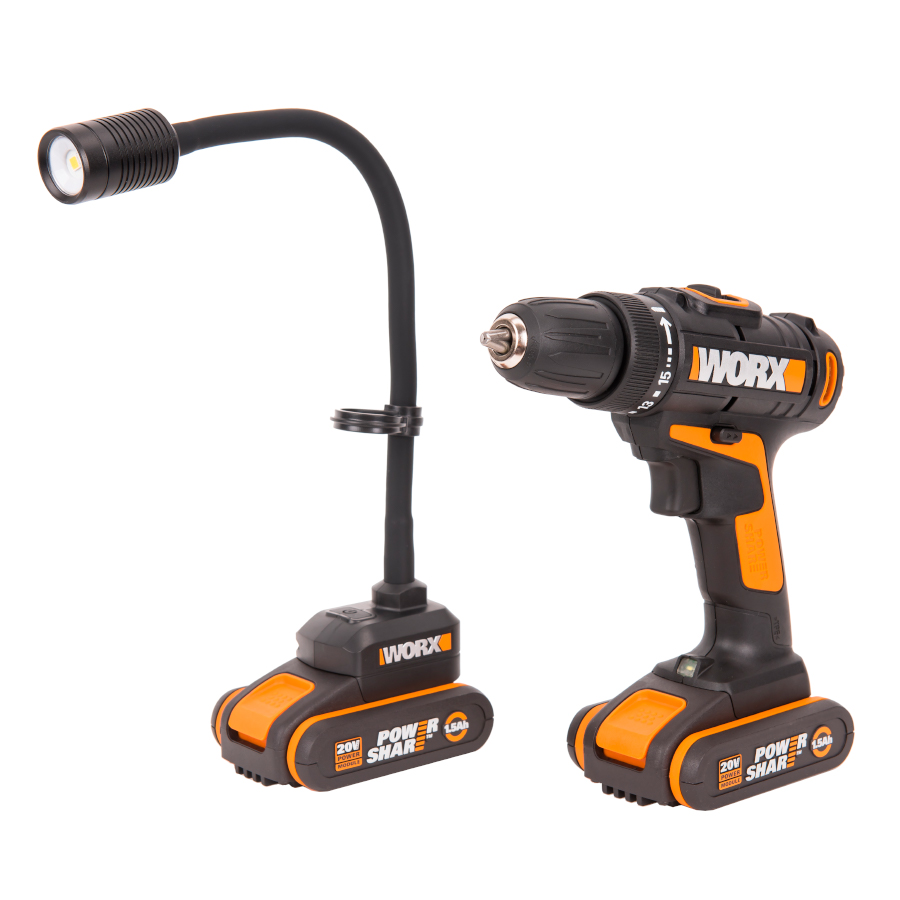 Легкая мобильная дрель WORX WX101 – это универсальное решение для домашнего использования и выездных работ. Компактный корпус устройства совместил в себе функции шуруповерта и дрели, а аккумуляторная конструкция обеспечила удобство работы без проводов. Дрель работает от универсального аккумулятора WORX Powershare, который оснащен электронной платой защиты от глубокого разряда и перегрева. Данная технология позволяет поддерживать оптимальную емкость батареи, гарантируя длительный срок ее службы. Несмотря на компактность, устройство оснащено двумя режимами скорости – для сверления и для работы с крепежом. Максимальный крутящий момент 30Нм позволяет решать любые задачи, а 15 ступеней регулировки момента затяжки обеспечивают работу с любым крепежом. Для удобства работы в условиях ограниченной видимости предусмотрена подсветка рабочей зоны. Быстрозажимной патрон с максимальным диаметром оснастки 10мм оснащен блокировкой шпинделя и фиксацией оснастки одной рукой. Для смены режима работы потребуется минимум времени и усилий. Аккумуляторная конструкция позволяет использовать инструмент вдали от центрального электроснабжения. Щеточный двигатель обладает низким уровнем потребления энергии, обеспечивая длительность автономной работы. Гибкий аккумуляторный фонарь WORX WX028 – это отличное решение в качестве местного или альтернативного источника освещения для мастерской или гаража. Компактный фонарь также незаменим для строительных работ на открытом воздухе или ремонта автомобиля в дороге. WORX WX028.9 имеет гибкую и прочную металлическую ножку, а также поворотную головку с диапазоном 360°. Гибкость и компактные размеры фонаря позволяют освещать труднодоступные места и узкие проемы. Также в фонаре предусмотрен специальный крюк для подвешивания. Фонарь оснащен яркими светодиодами до 300Лм, которые заменяют обычные лампы накаливания 30Вт. Дистанция освещения – до 20 метров. Гибкий фонарь работает от универсального аккумулятора Worx Powershare 20В, который также служит устойчивым основанием. Литий-ионная батарея защищена электронной платой и не боится глубокого разряда. Легкий, неприхотливый и удобный фонарь имеет вес всего 0,2кг без аккумулятора и обеспечивает автономную работу до 11 часов!